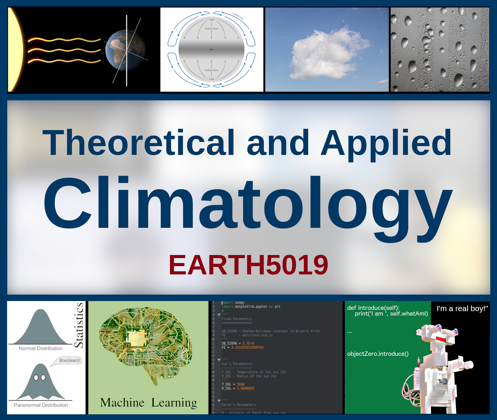 Description – The course provides an introduction to fundamental aspects of theoretical and applied climatology. This is complemented by an introduction to coding, practical statistics, machine learning, and computational modelling. See more details here.